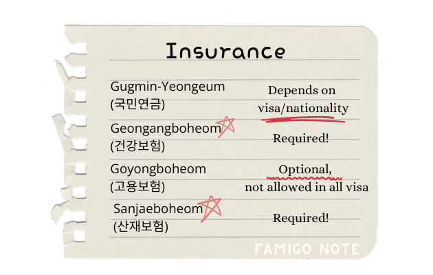 There are 4 types of insureance. It is called "sadaeboheom"(사대보험). There are "gugmin-yeongeum"(국민연금), pension for citizens, "geongangboheom"(건강보험), health insurance, "goyongboheom"(고용보험), employment insurance, and "sanjaeboheom"(산재보험), industrial accident insurance.