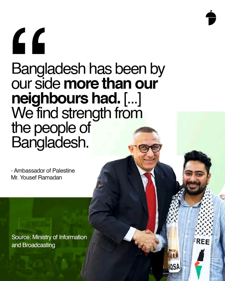 Ambassador of Palestine Mr. Yousef Ramadan stated, "We, Palestinians have a shared story of struggle and resistance. Since her independence, Bangladesh has been by our side more than our neighbours had. We are proud to share the same determination and resilience against oppression with the people of Bangladesh. I still remember, when I was young and fighting for my land, many young men from Bangladesh left their lives behind to join our fight. I am thrilled for the newfound freedom for all these freedom loving people. We find strength from the people of Bangladesh.