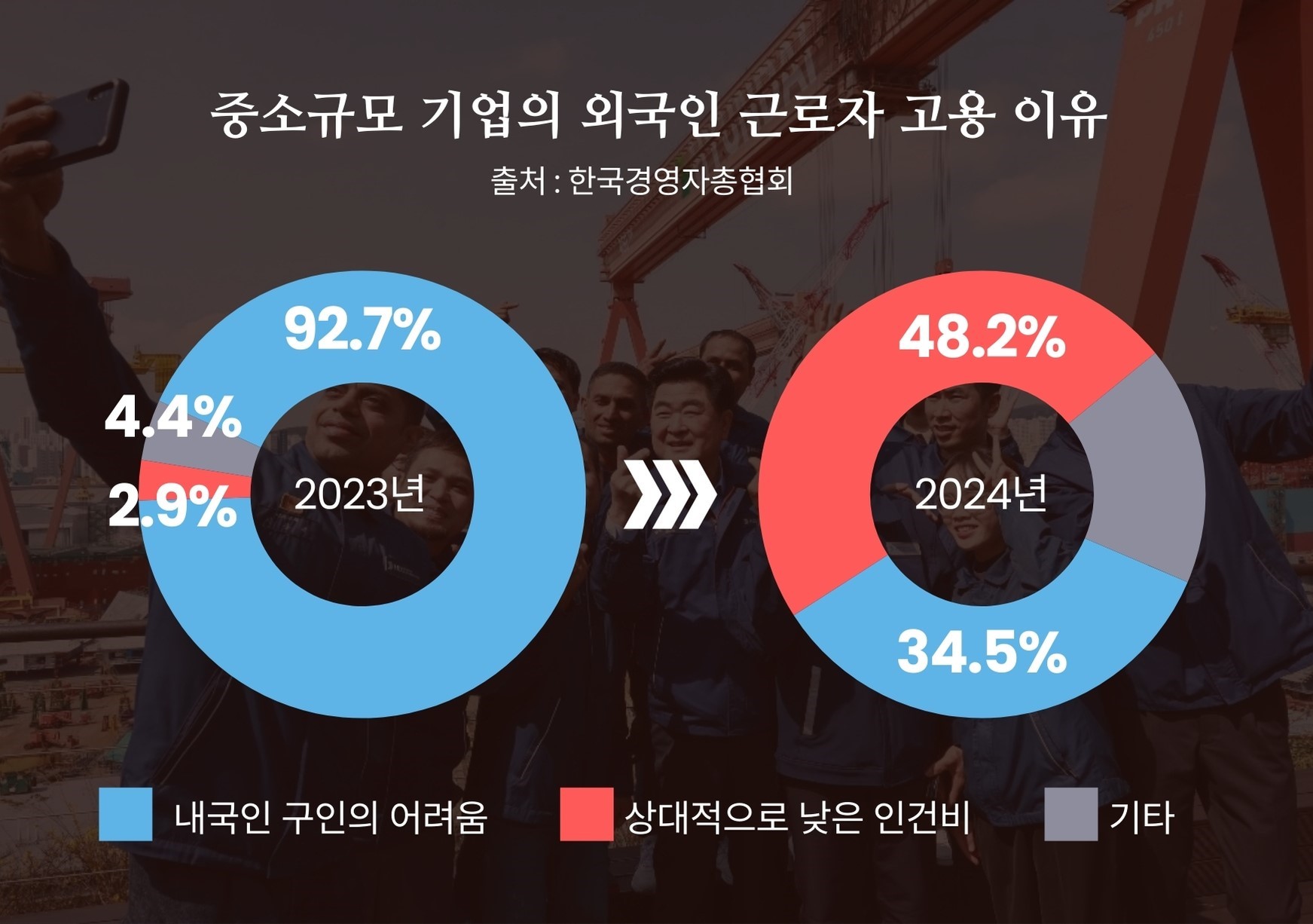 다음으로는 '내국인 구인 어려움'(34.5%), '2년 초과 고용 가능'(6.8%), '낮은 이직률'(6.5%) 등의 이유가 뒤를 이었습니다. 특히, 지난해 같은 조사에서 92.7%가 '내국인 구인 어려움'을 이유로 꼽았던 것과 대조적인 결과를 보여줍니다.