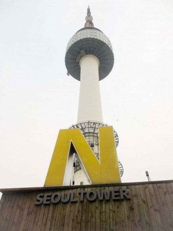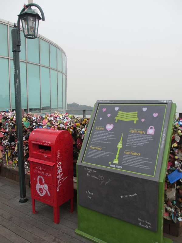 Hundreds, maybe thousands of locks hung along the fences of the roof terrace, and along “love lock” trees at N Seoul Tower on Mt. Namsan. LOVE LOCKS are padlocks inscribed with names and sometimes words of affection which are fixed unto public fixtures (ie a bridge, gate or fence) as a symbolism of commitment and eternal love between two people.