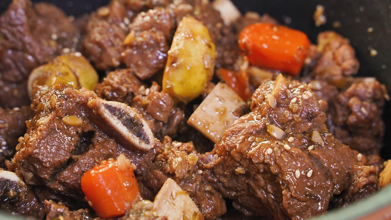 Galbijjim is a traditional Korean braised short rib dish served on special occasions. In Korean households, you'll often find it on the table at family gatherings or on national holidays such as New Year’s Day or Chuseok (South Korean mid-autumn harvest festival). The pork or beef short ribs are steamed in a well-seasoned soy sauce along with a variety of vegetables. The meat is prepared in a large pot, and cooked until it becomes tender enough to fall off the bone.